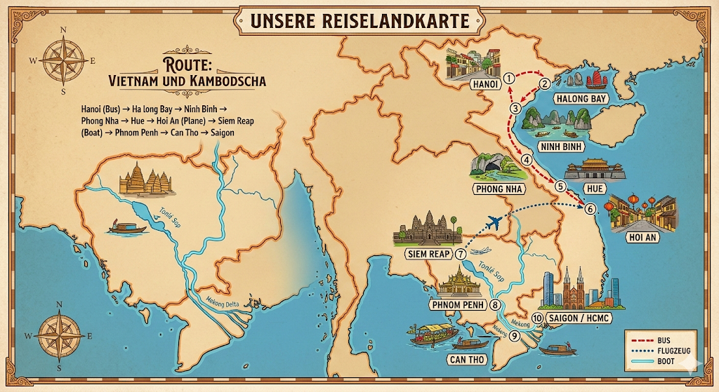 Die Südostasien-Reise führt uns durch Vietnam und Kambodscha. Der Reisezeitraum ist vom Freitag dem 13.08.2027 bis 04.09.2027.
